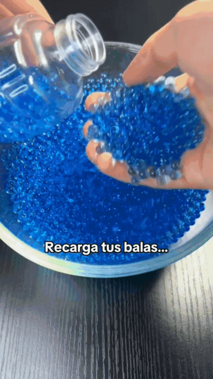 - 💧 Munición: bolitas de hidrogel biodegradables y seguras.